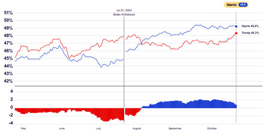 从两家调查机构提供的数据可以看到,从10月6日开始,哈里斯的支持率总体持平,而特朗普的支持率正在不断上升,双方的支持率正在趋向持平。