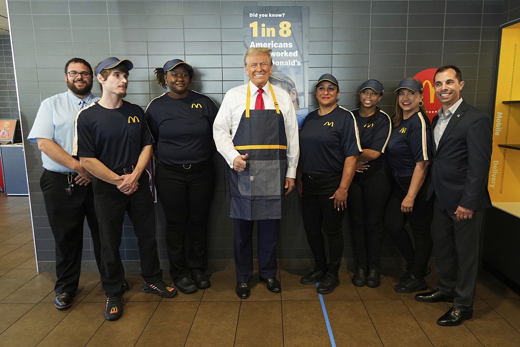 特朗普说,这是他“一生都想做的事,我喜欢这份工作”。特朗普还宣称此举是在揭穿民主党总统候选人哈里斯的谎言。先前,哈里斯在一次竞选集会上提到,她学生时代曾在麦当劳工作过,做炸薯条和冰淇淋。