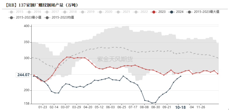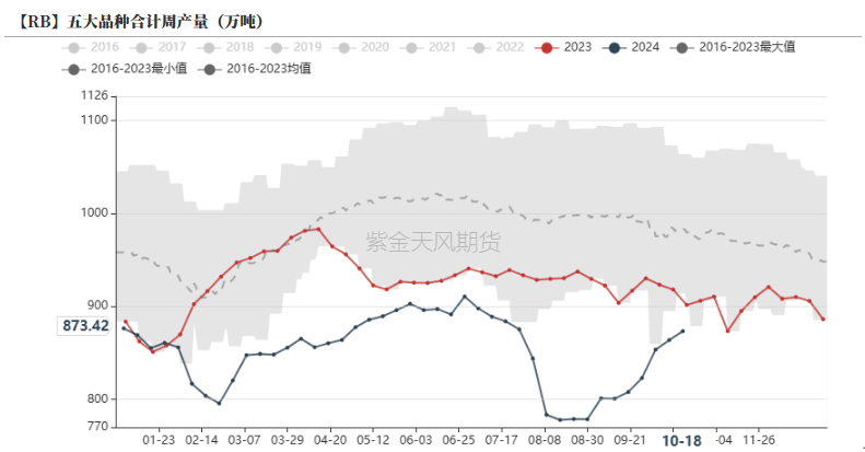 截止10月18日,Mysteel样本企业周度需求量环比小幅回升至12.79万吨,五大钢材周产环比上行至873.42万吨,其中螺纹产量244.07万吨,周环比上行7.81万吨。