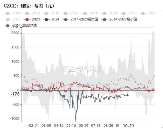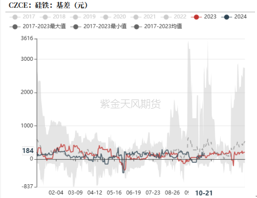 盘面快速回落,现货跟跌,硅铁基差走强,截至10月21日,基差为184元/吨。