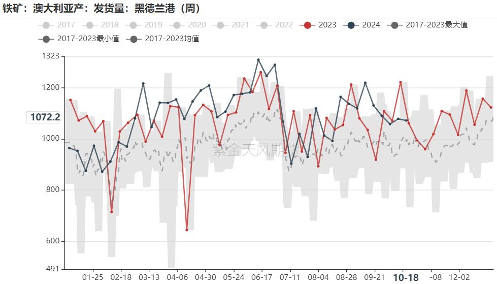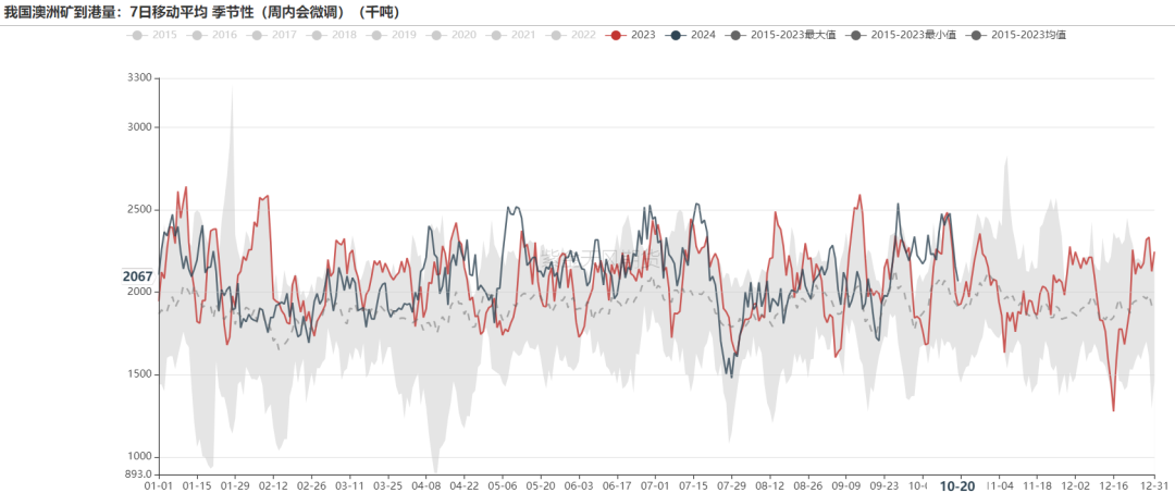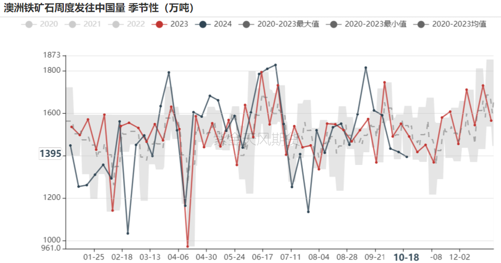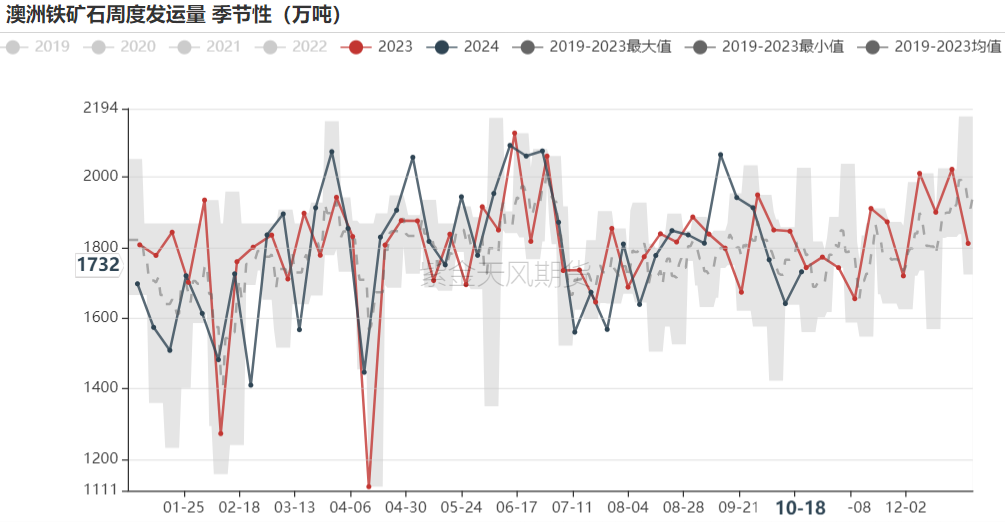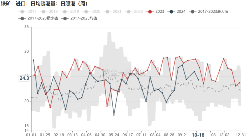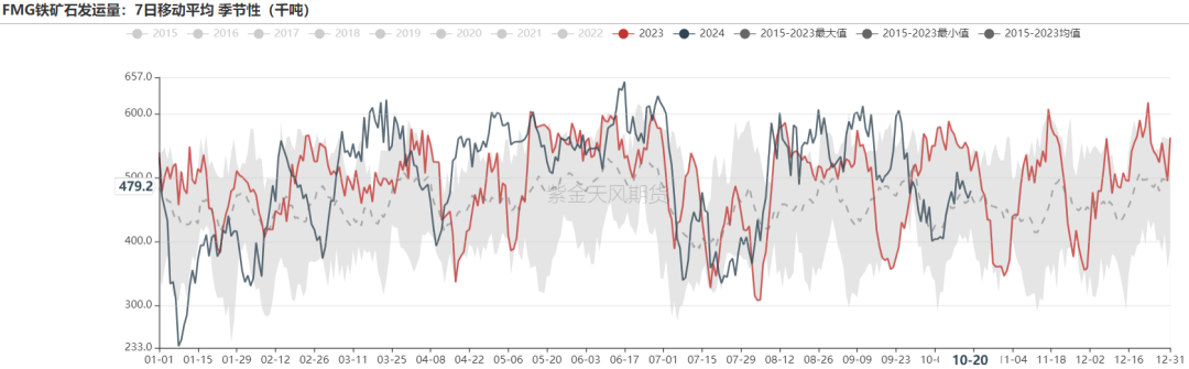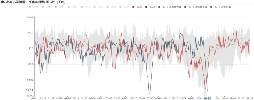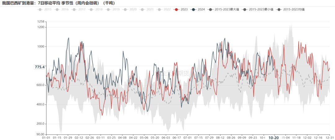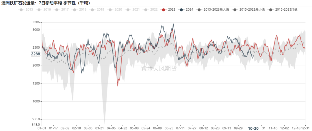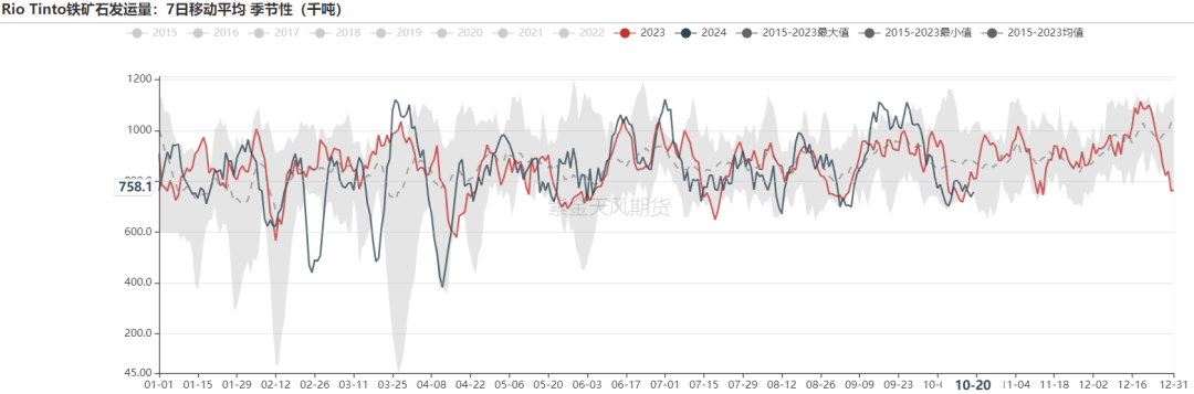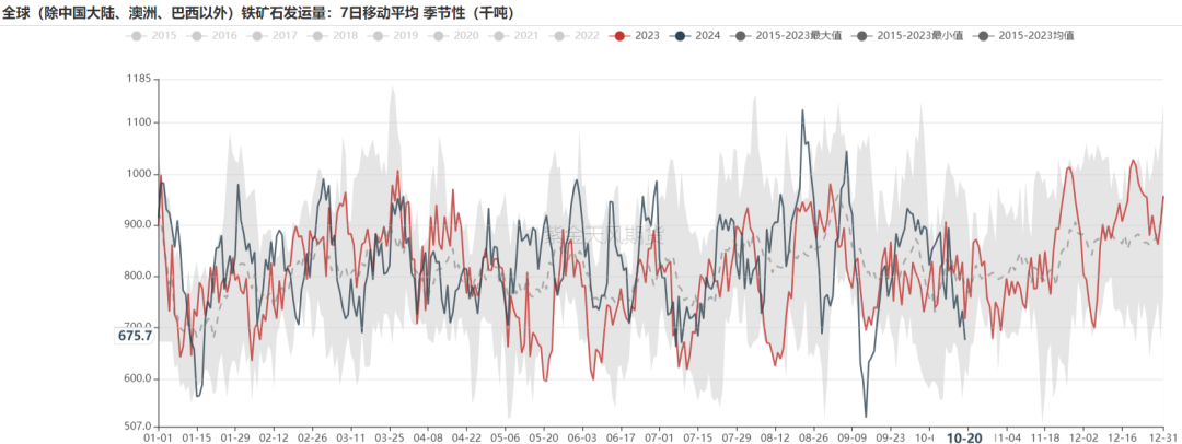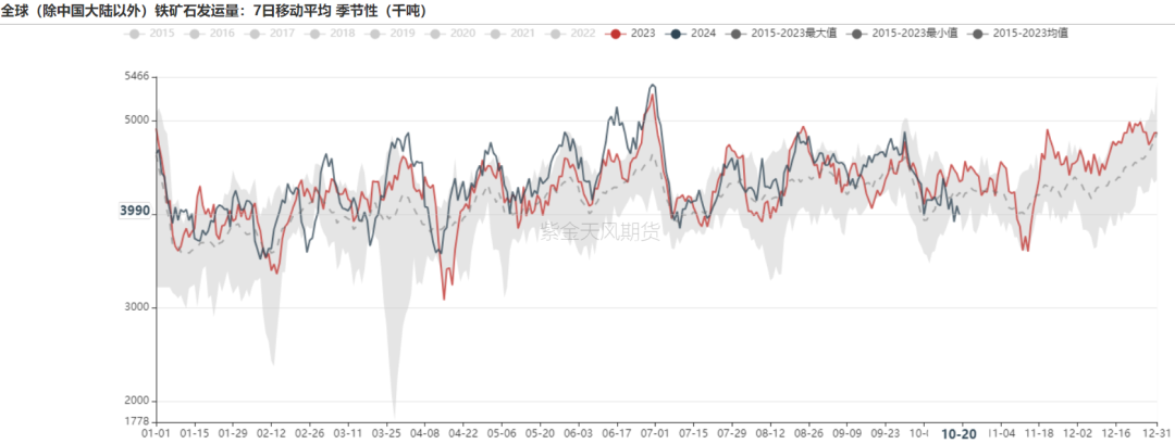 路透口径:2024年10月20日,路透全球铁矿7日移动平均发货量3990千吨,周环比降8.0%,同比降8.2%。澳洲7日移动平均发货量2463千吨,周环比降7.1%,同比降8.9%;巴西7日移动平均发货量1018千吨,周环比持平,同比降8%。