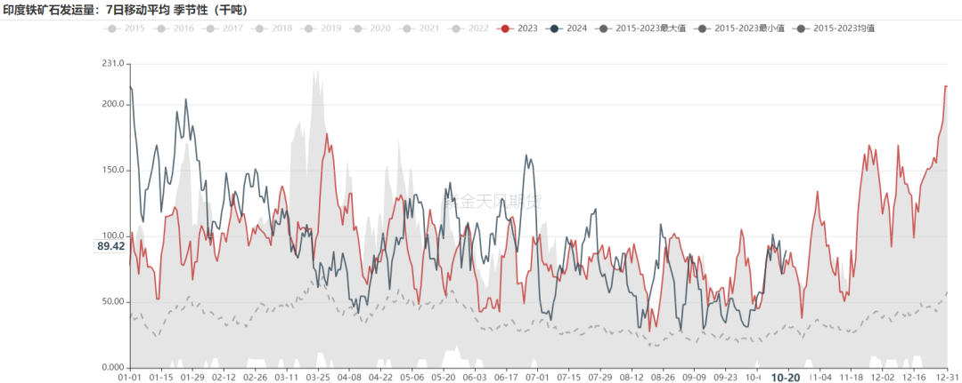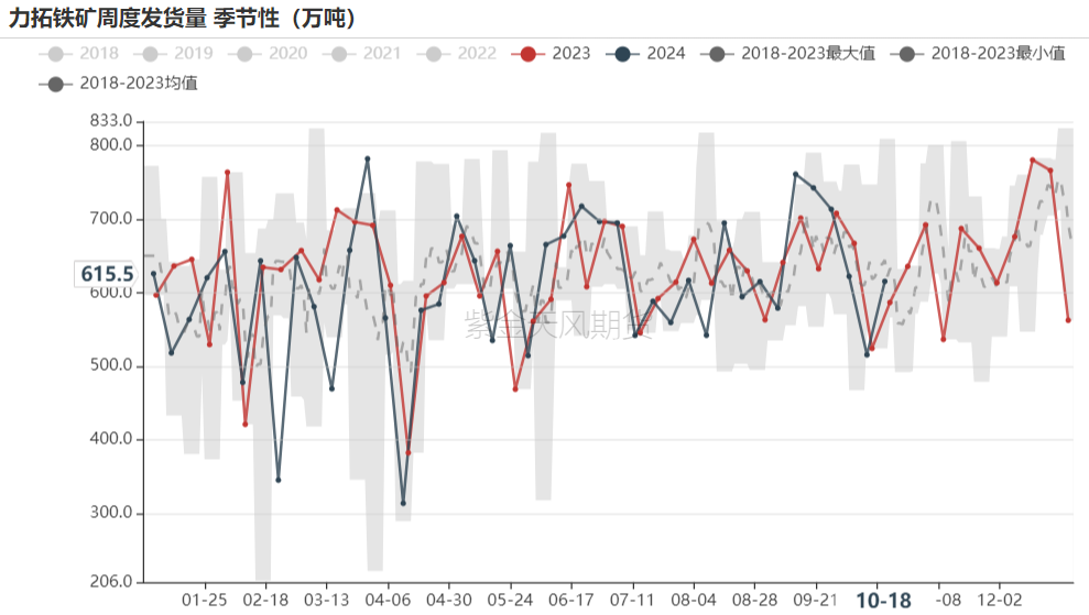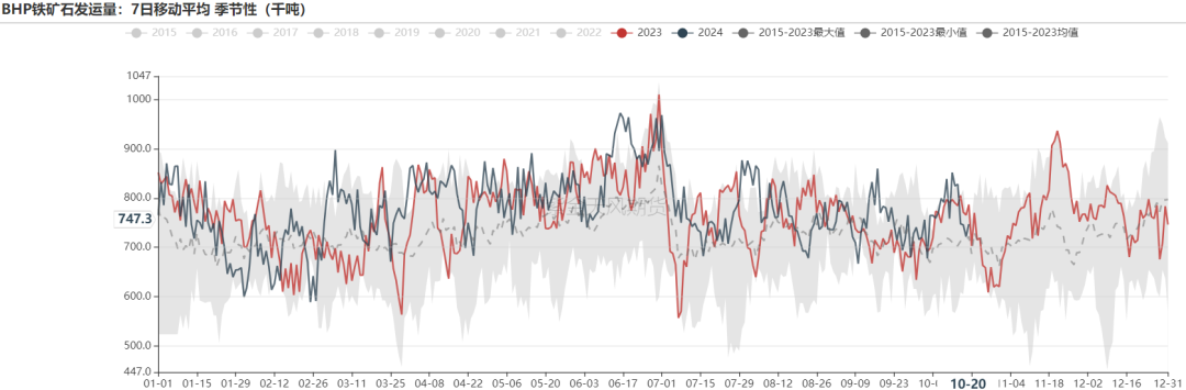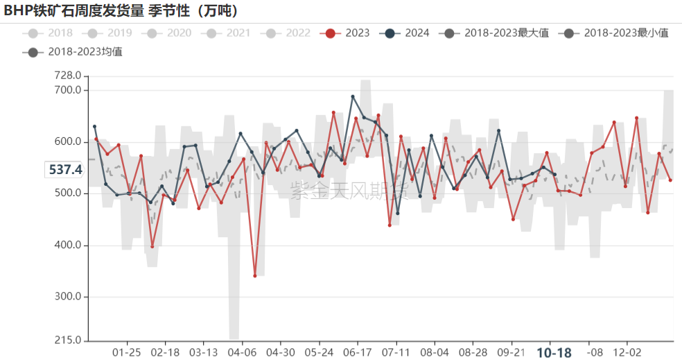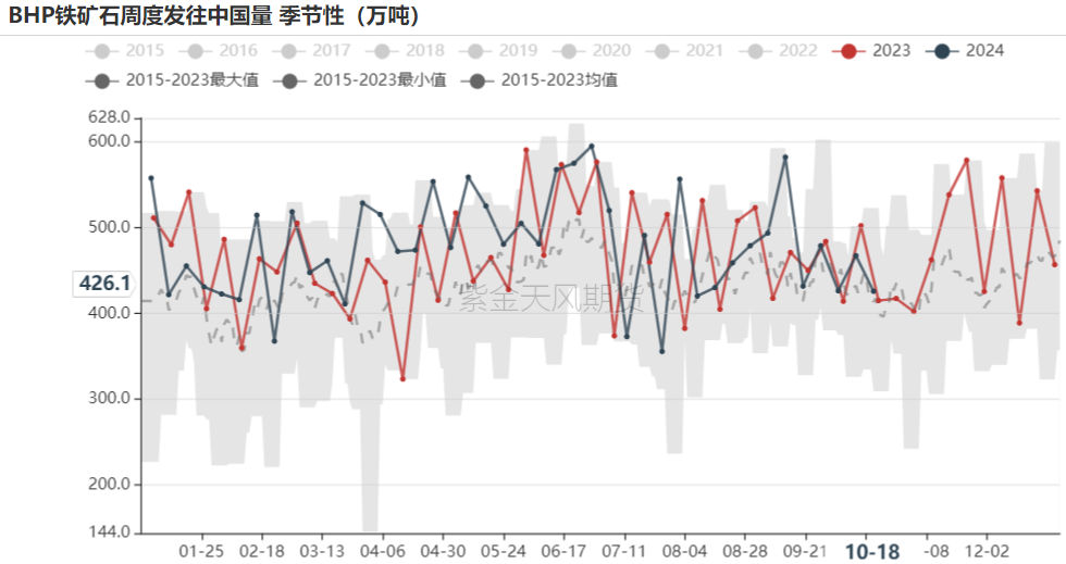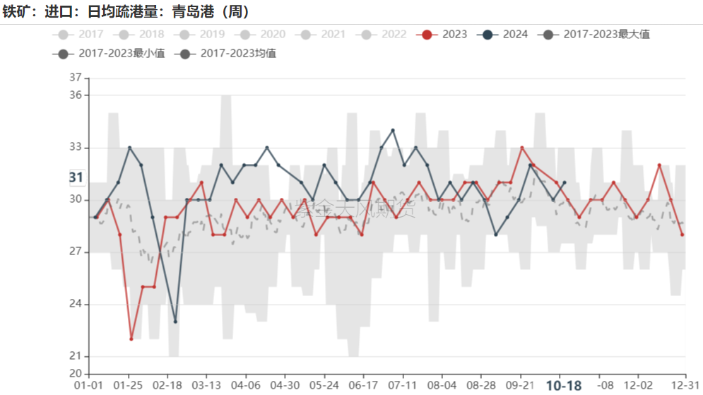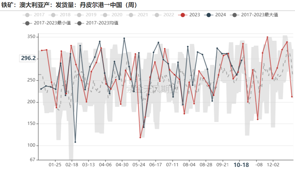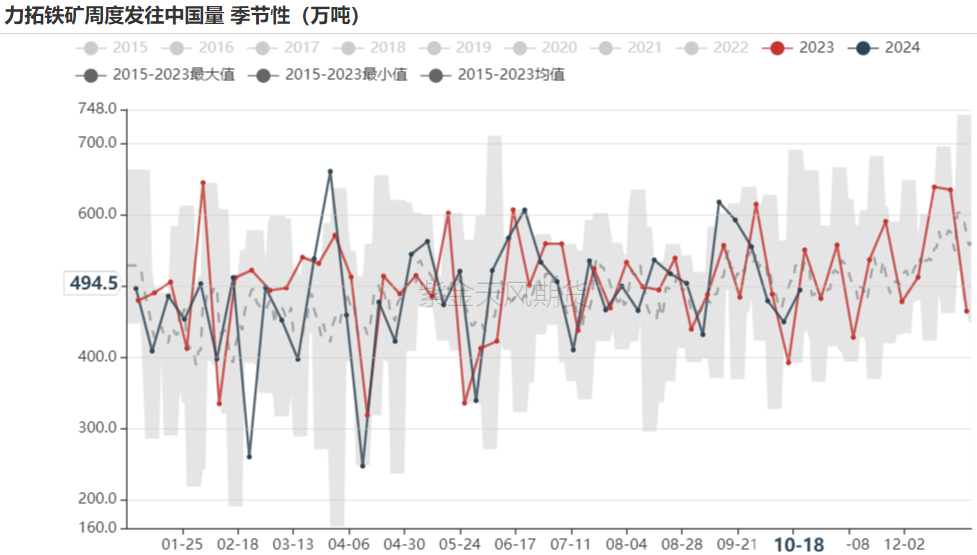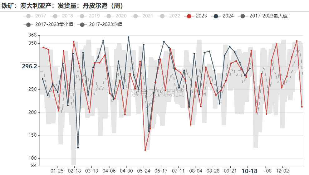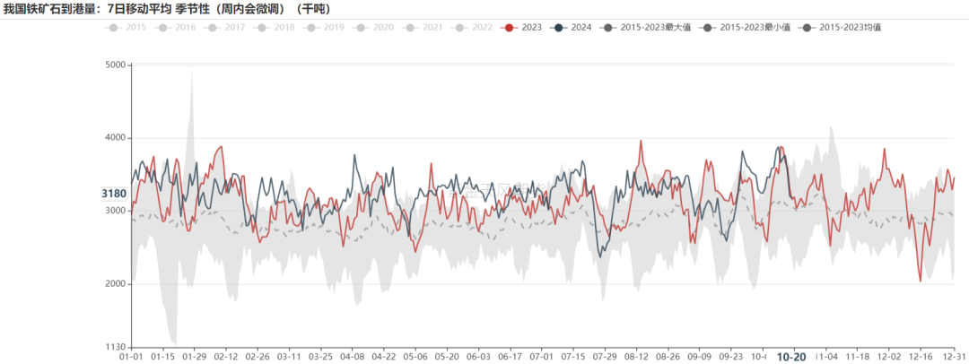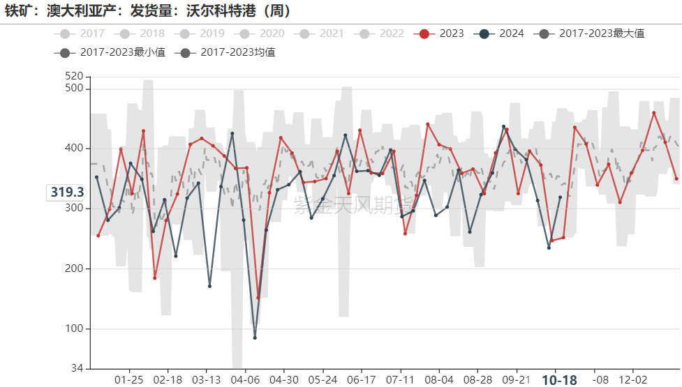 路透口径:2024年10月20日,路透全球铁矿7日移动平均发货量3990千吨,周环比降8.0%,同比降8.2%。澳洲7日移动平均发货量2463千吨,周环比降7.1%,同比降8.9%;巴西7日移动平均发货量1018千吨,周环比持平,同比降8%。